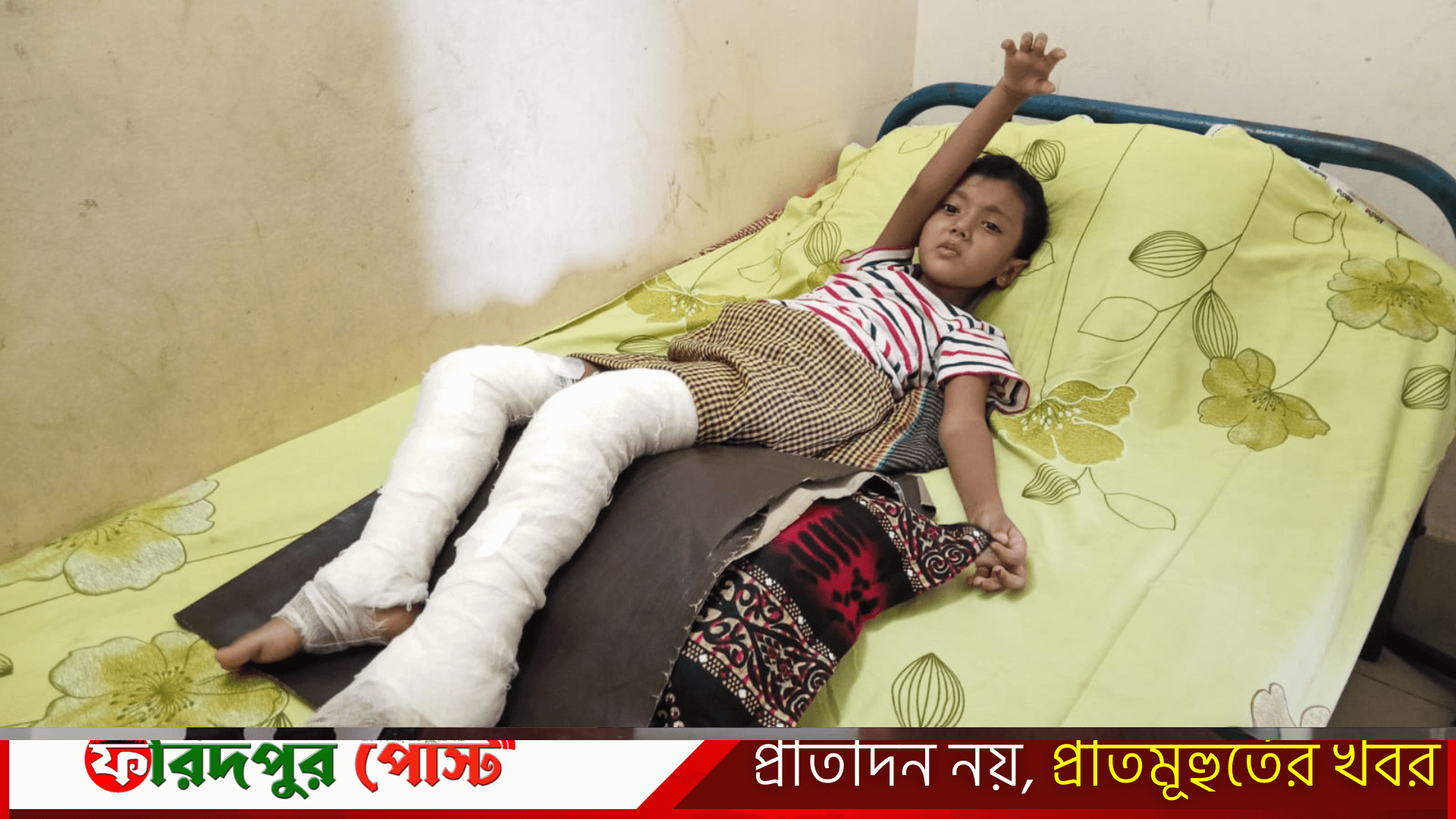 শুক্রবার (০১ আগস্ট) সন্ধ্যায় ফরিদপুর মেডিকেল কলেজ হাসপাতালের বার্ণ ইউনিটে গিয়ে দেখা যায়, শিশুটির দুটি পায়ে ব্যান্ডেজ দিয়ে বেঁধে রাখা হয়েছে। অসহ্য যন্ত্রণায় মাঝে মাঝে চিৎকার করছে। পাশে মা কৃষ্ণা হালদার বসে অঝোরে কাঁদছেন। ৪ বোনের মধ্যে সকলের আদুরে ছোট বোনের এমন অবস্থায় তাকে ঘিরে বসে আছেন অপর দুই বোন।